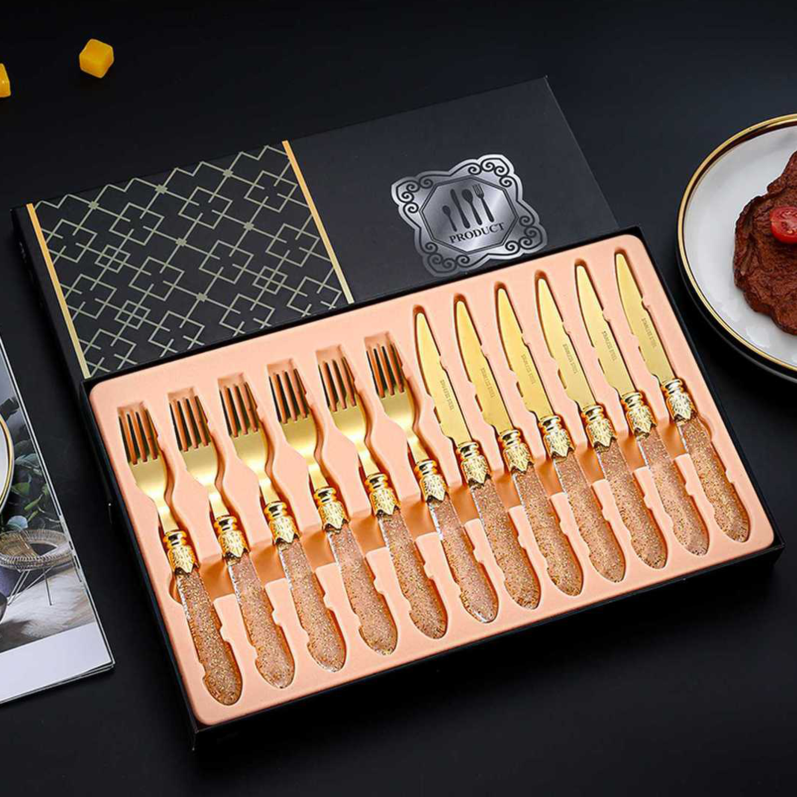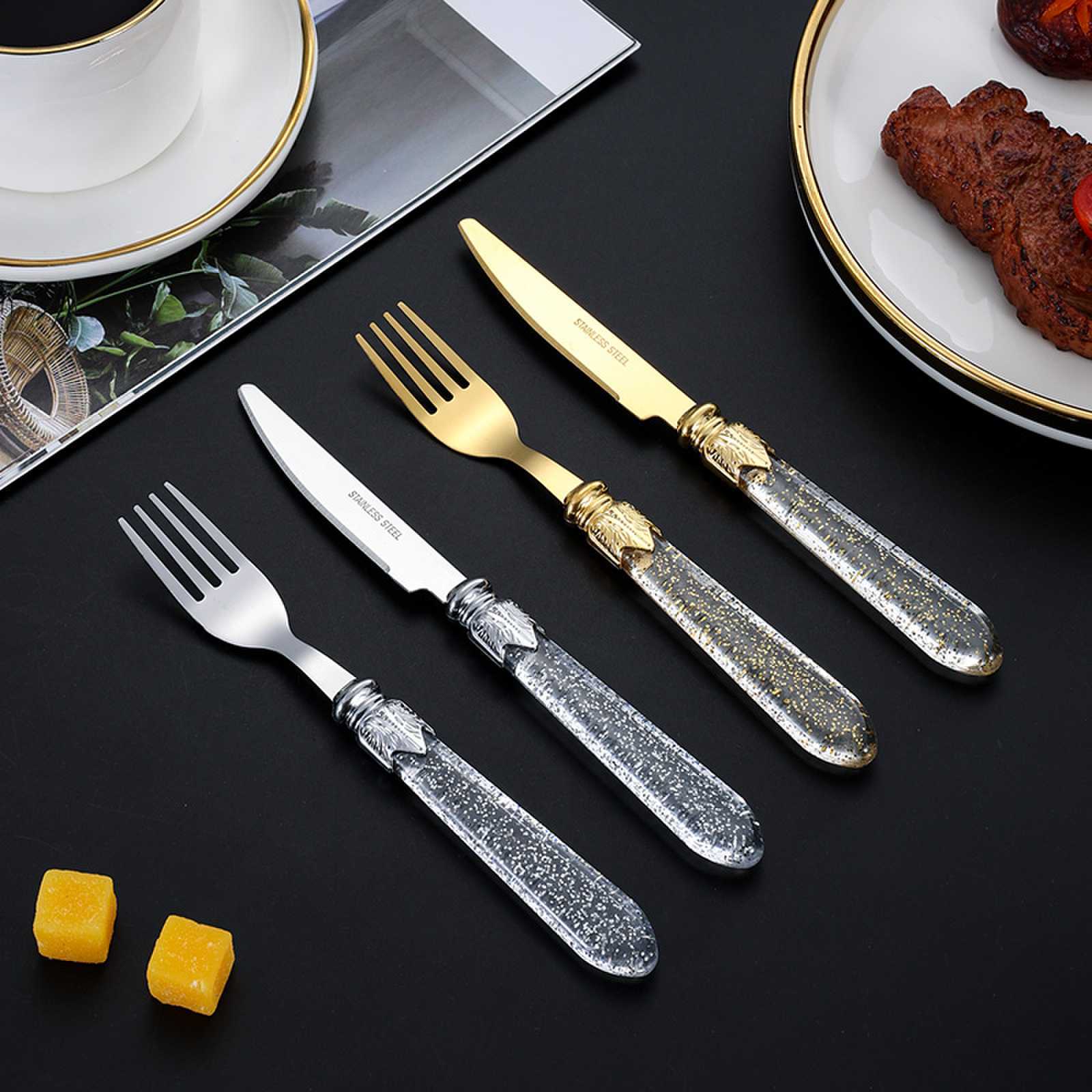 4. 12 Piece Knife and Fork Gift Box Set Transparent Handle Tableware Hotel Steak Knife Dessert Fork Flatware Set