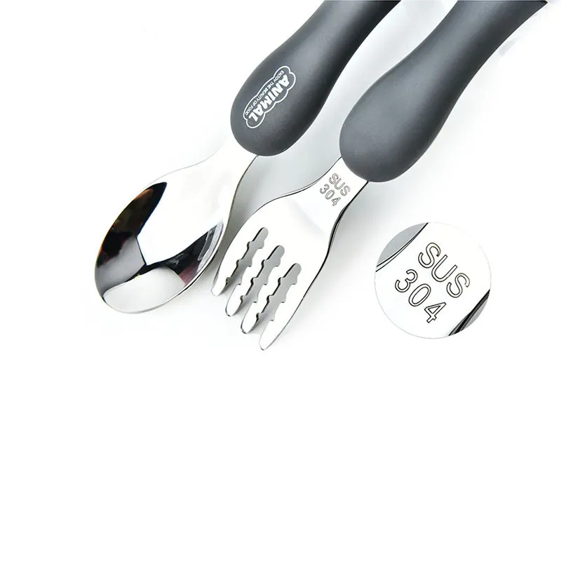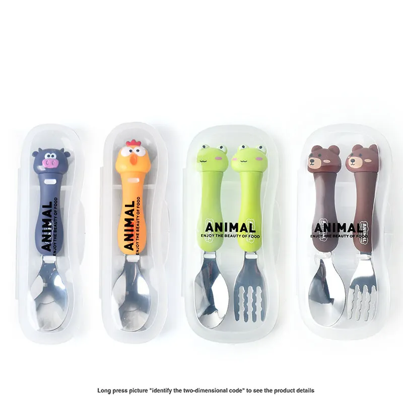 2pcs Portable Cute Cartoon Animal Flatware 304 Stainless Steel Cutlery Set with Plastic Pp Handle for Children Kid Baby