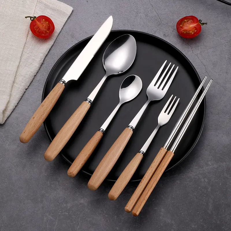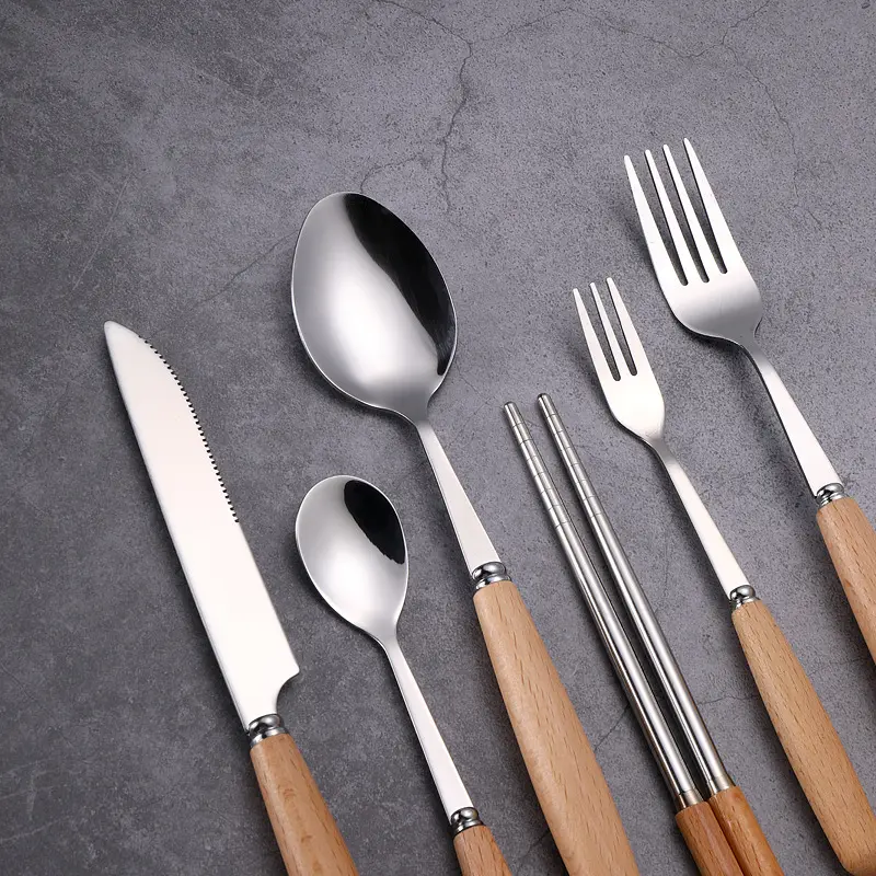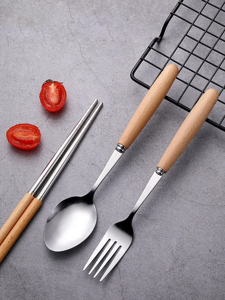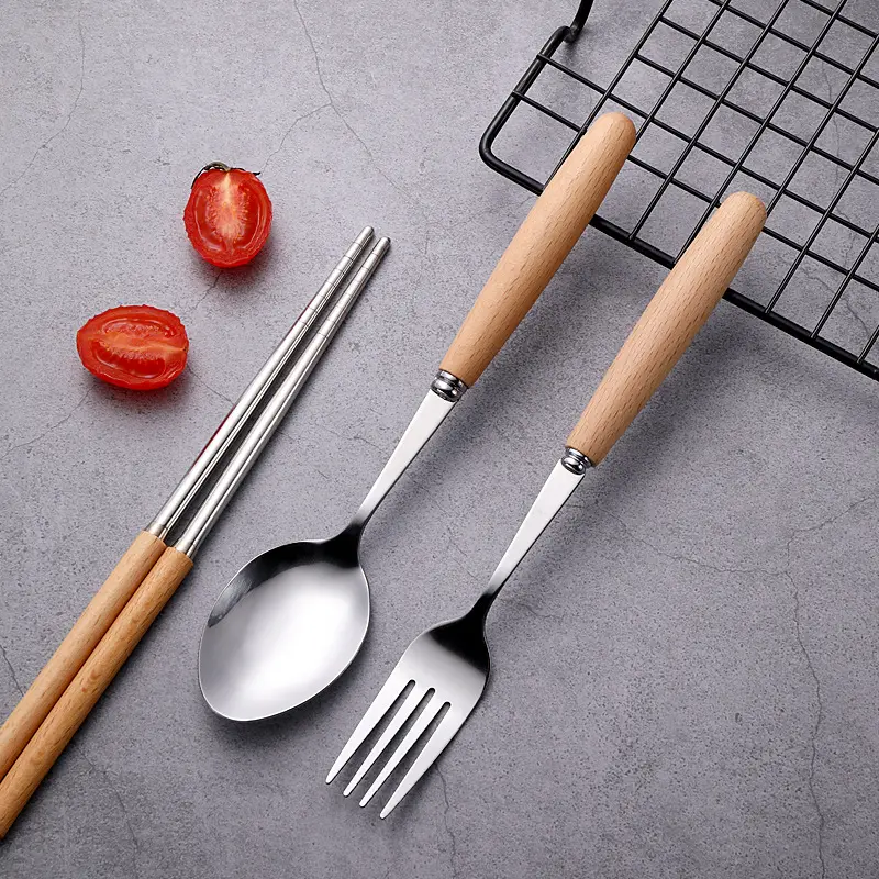 3 in 1 Portable Reusable Outdoor Wood Handle Flatware Picnic Camping Travel Metal Fork Cutlery Set in Case