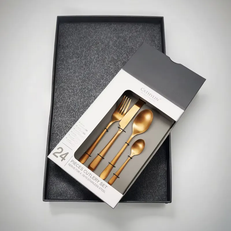 Cathylin China Manufacturer 24 PCS Gold Flatware Wood Handle Stainless Steel Cutlery Set with Box for Gift Wedding