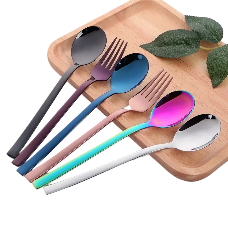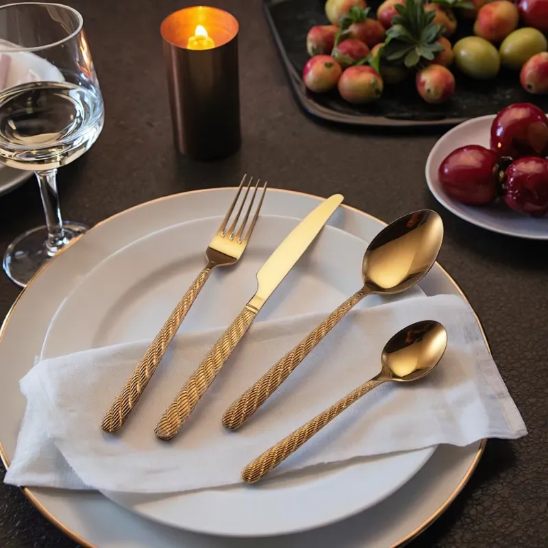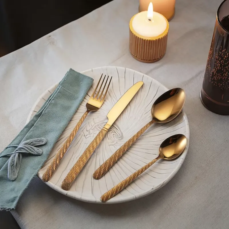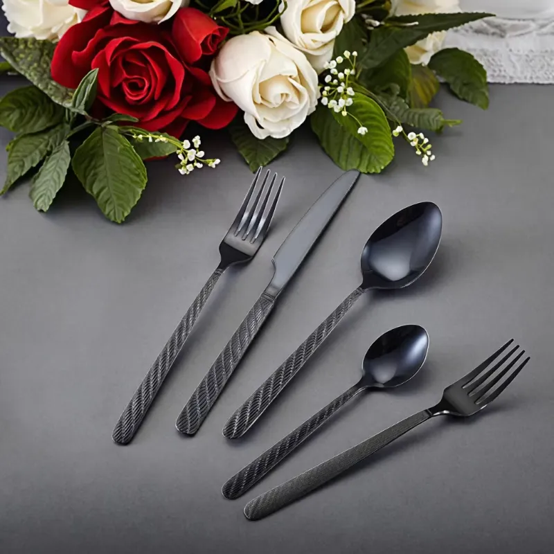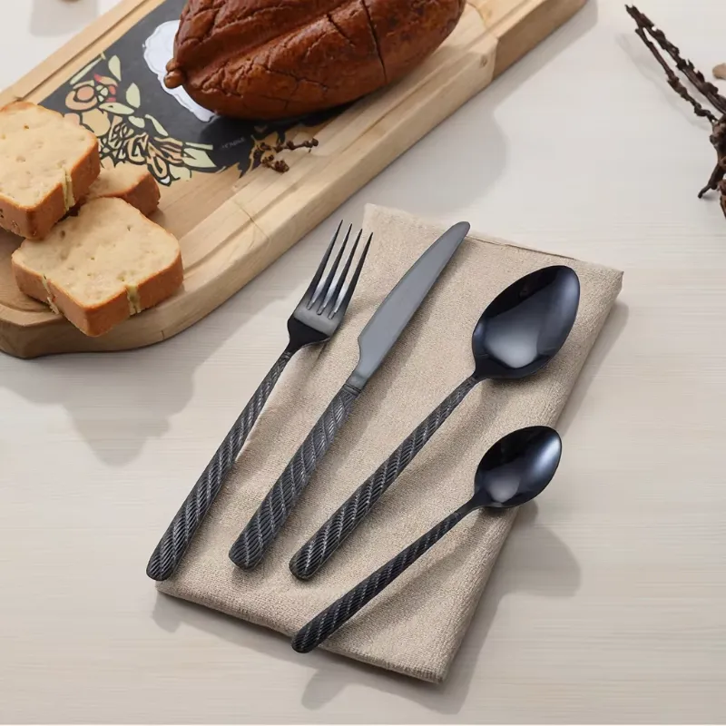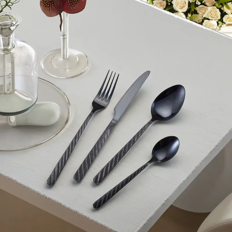 Cathylin Stock 4 PCS Striped Pattern Handle Rose Gold Black Cutlery Stainless Steel Flatware Set for Hotel Restaurant Event