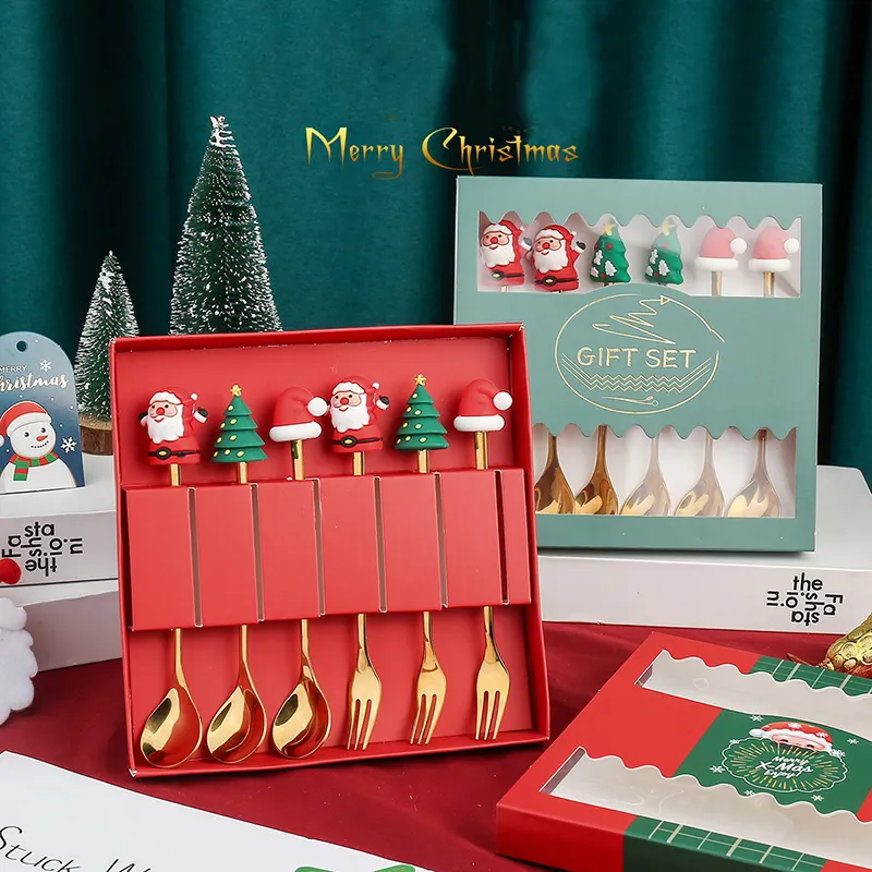 Christmas Gift Set Gold Plated Flatware Metal 410 Stainless Steel Coffee Dessert Spoon Fruit Fork Cutlery in Box
