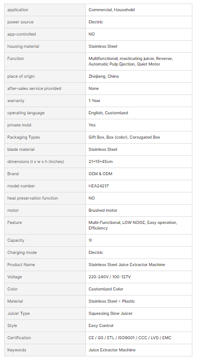 Custom Automatic Electric Fruit Vegetable Masticating Juicer Cold Press Slow Juicer Stainless Steel Juice Extractor Machine