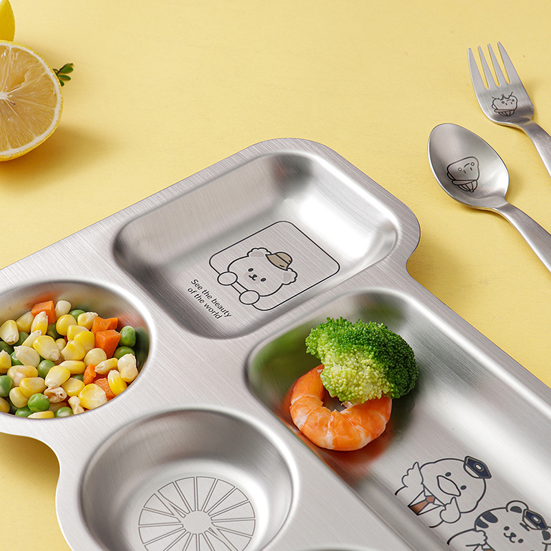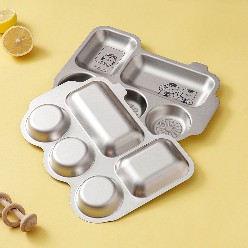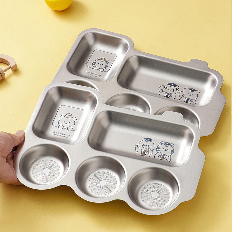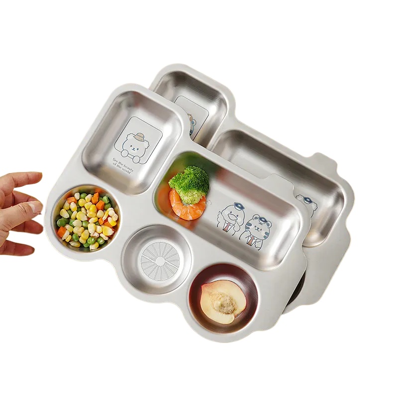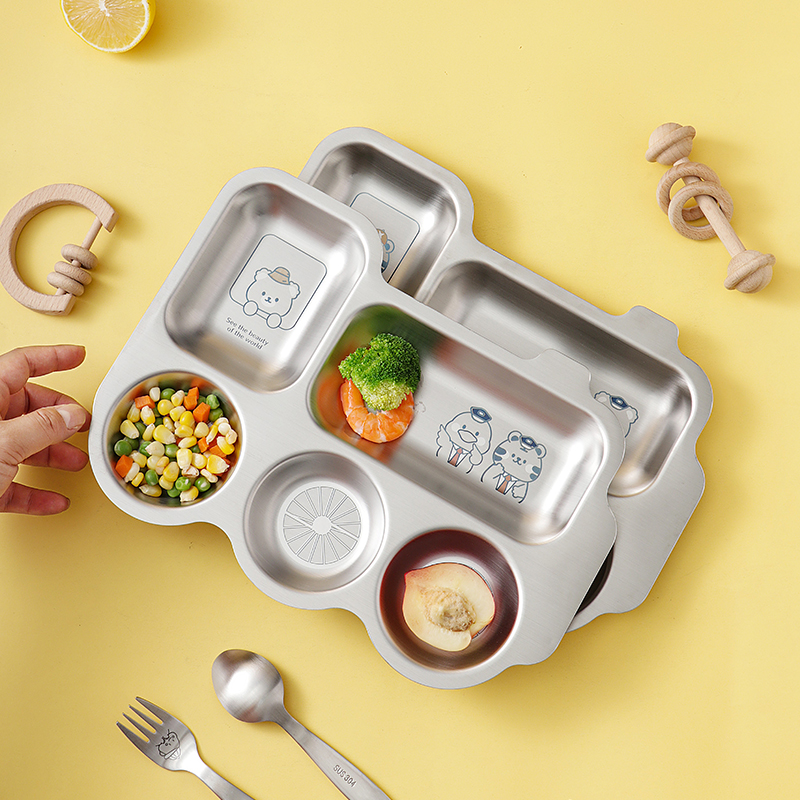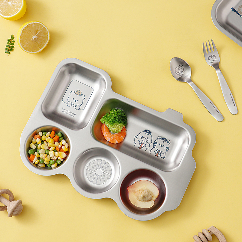 Custom Cute Cartoon Animal Children Train Shape Stainless Steel 304 Tableware 5 Compartment Plate Dinner Set for Kids Baby
