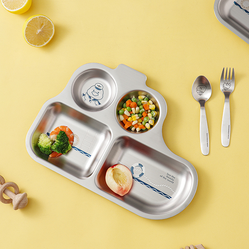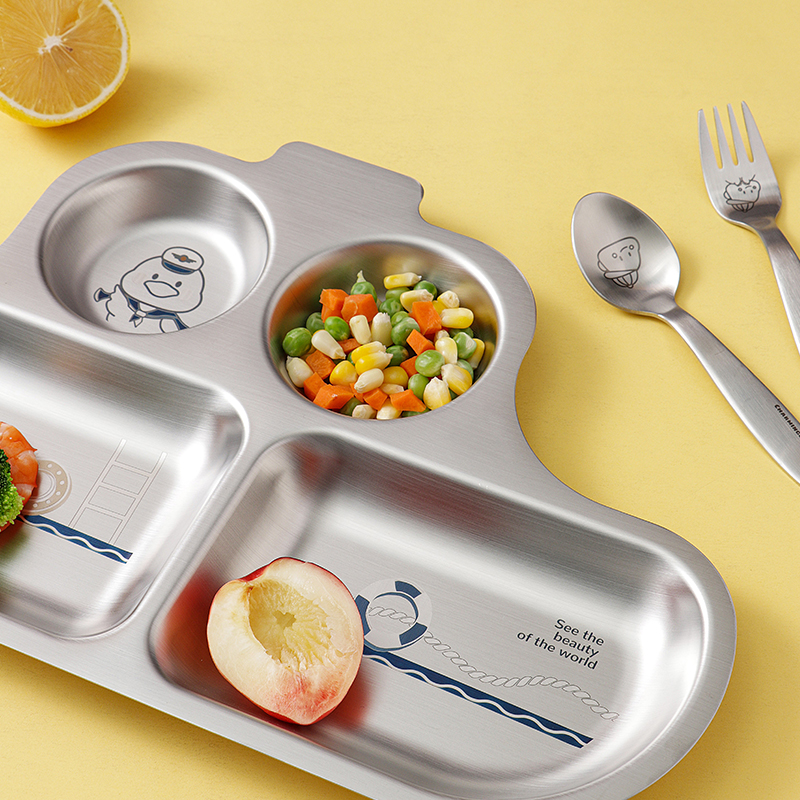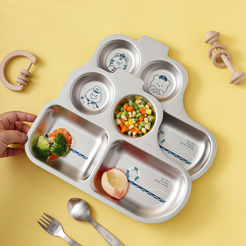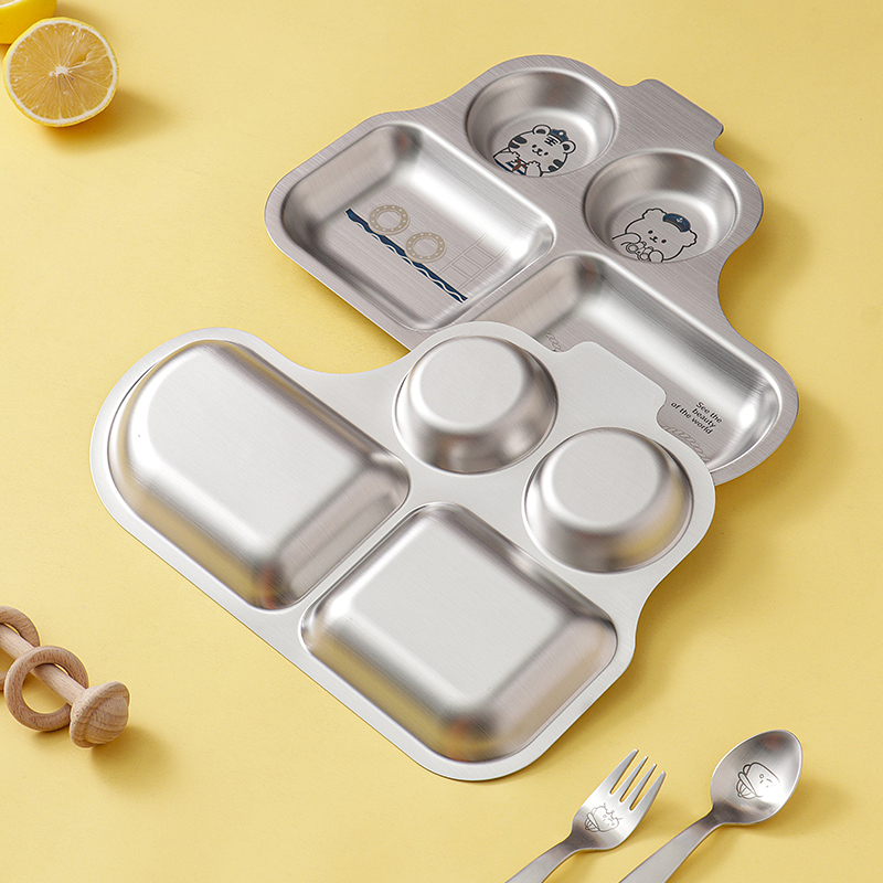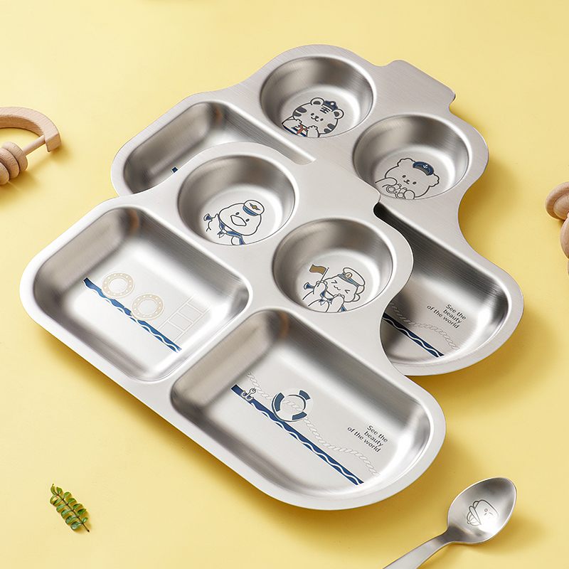 Cute Cartoon Animal Children Cruise Ship Shape Stainless Steel 304 Tableware 4-Compartment Plate Dinner Set for Kids Baby