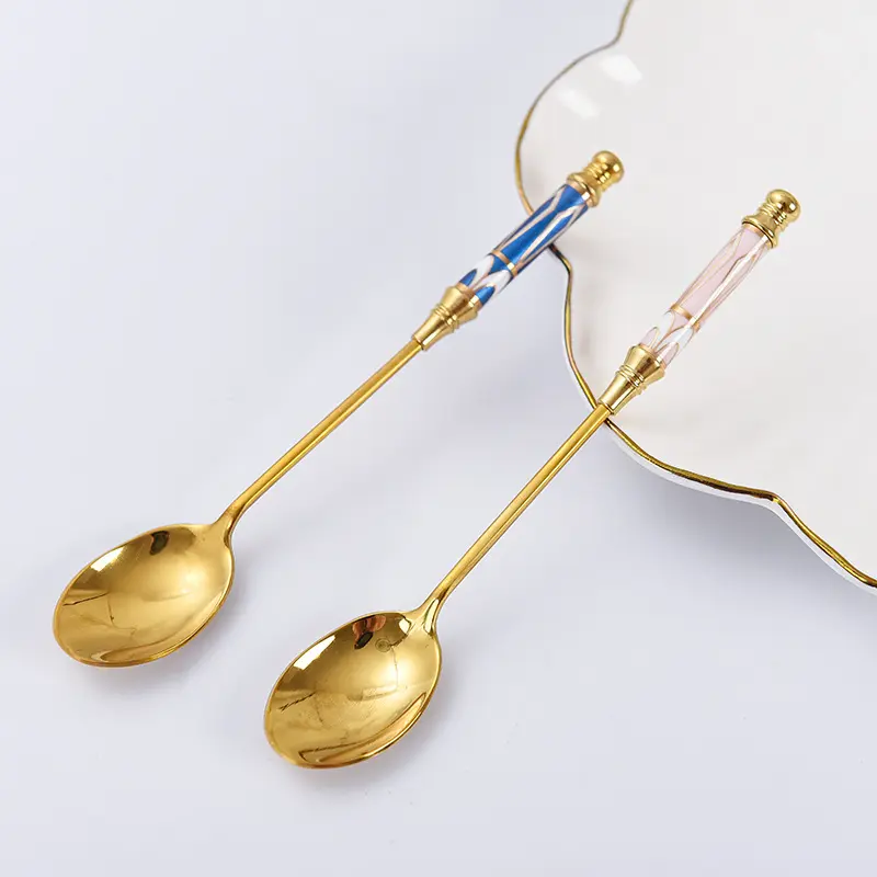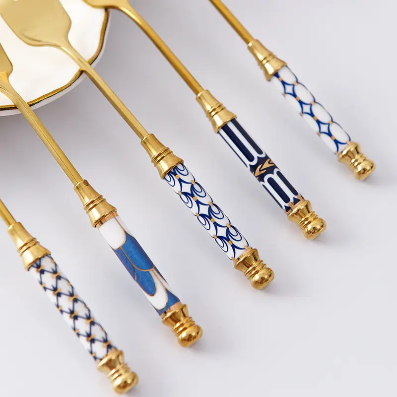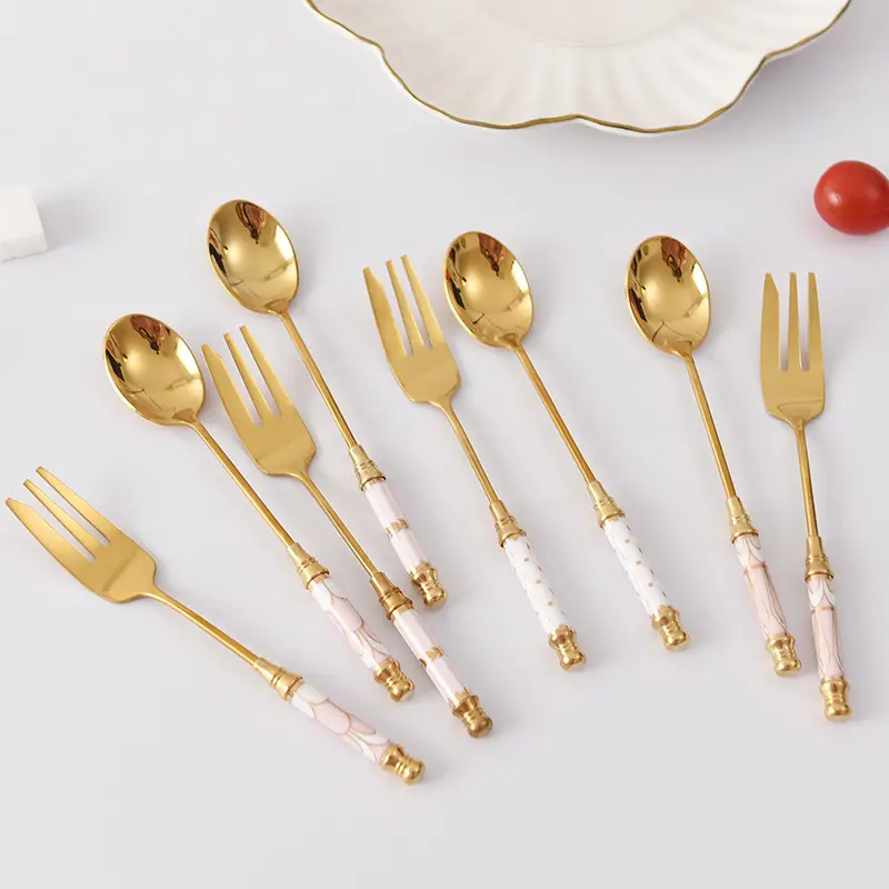4. England Elegant Gold Coffee Spoon Metal Stainless Steel 304 Dessert Fork Spoon with Long Ceramic Handle