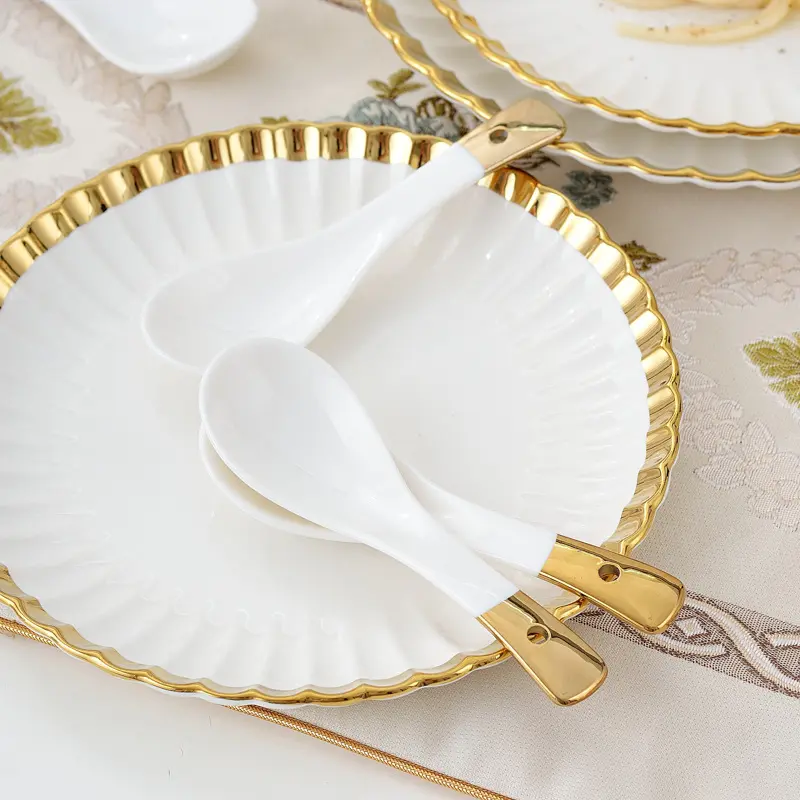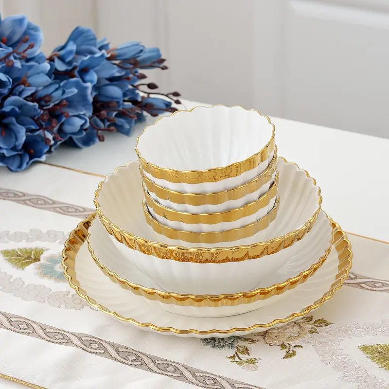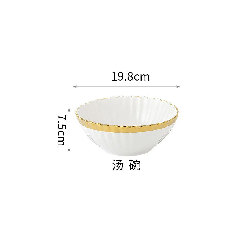 4. Nordic High-end Tableware Bowl Plates Sets White Gold Rim Ceramic Dinnerware Luxury Crockery Dinner Sets