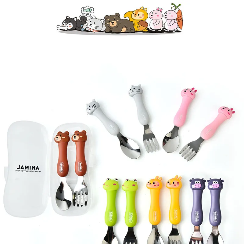 2pcs Portable Cute Cartoon Animal Flatware 304 Stainless Steel Cutlery Set with Plastic Pp Handle for Children Kid Baby
