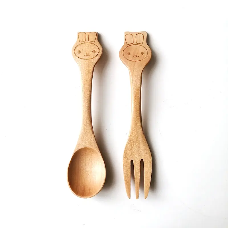 Cute Rabbit Elephant Animal Shape Design Wood Flatware 2 Pcs Fork Spoon Cutlery Set for Children Kid Baby