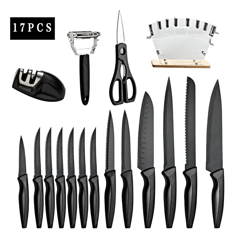 Multifunctional Cheap 17 PCS Stainless Steel Manual Sharpener Stone and Scissor Kitchen Knife Set with Rack